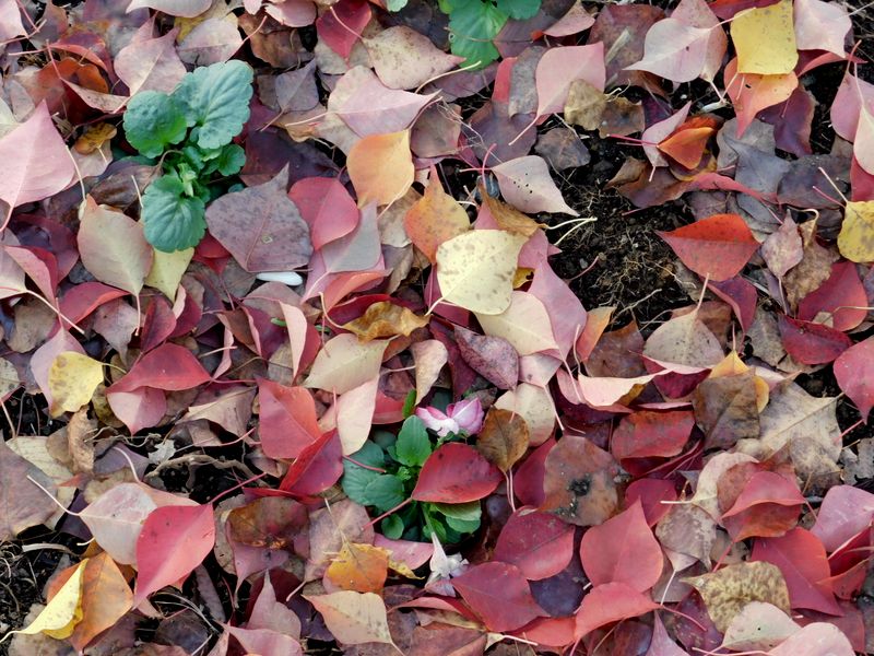 -- ナンキンハゼの落ち葉とパンジーの苗。