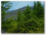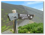 「三合」で「宝永第三火口」への道を右に分けます。森林はカラマツがメインですが、その背丈がずいぶんと低くなりました。山に引き寄せられるように登り続けます。三合から20分ほどで、樹間に山頂が見えました。一気に元気が倍増します。さらに「三合五勺」に至ると、パッと前方が開けました。この辺りが森林限界でしょう。登山歩道の幅が広くなり、スコリアの道が山頂に真っ直ぐ続くかのように見えます。道の中心に、白いコースロープが置かれています。