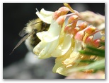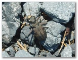 「四合」に戻ります。宝永第二火口の下縁、小鞍部に道標が見えます。四合からその地点に向かって急傾斜のザレ道を下っていくと、大きな岩が程よい日陰をつくっていました。イワオウギの花が咲き、マルハナバチ、シジミチョウ、ツマグロヒョウモンなどがいて、いい感じです。ここで腰を下ろし、食事にしました。眺望は抜群。富士山屈指の優美な空間と言えるかもしれません。大岩が強風を遮り、何とも平和なランチタイム。極上の休憩所ですが、定員は最大2名です。