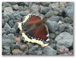 森林限界まで下ると、「御殿庭上」です。ここで、歩行モードを「花・虫探索モード」に切り替えました。「御殿庭」と言うのですから、その庭にどんな花が咲き、虫が生きているのか、楽しみです。分岐点の道標を見て、「水ヶ塚・御殿庭」方面に進みました。メルヘンチックな宝永第三火口のすり鉢をもう一度眺め、再び森林に入ります。すると、さっそくアサギマダラがふうわり、ふうわり、と飛んで来ました。長駆省エネ飛行の達人、ロマンをかき立てる蝶です。