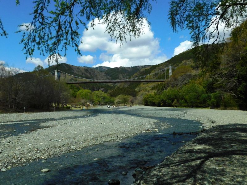 -- もうすぐ風の吊り橋。柳の木の下で。