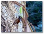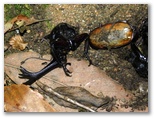 秦野市 ◆朝イチで大山山麓に行き、蛾の探索をした。これが予定より早く終わったので、葛葉緑地へ足を延ばす。きょうは丹沢・大山フリーパスBを買ってきたので、追加の費用は無い。◆秦野駅2番乗り場からバスに乗り、宮上(みやうえ)で下車。少し戻って、葛葉緑地の看板のある路地に入ると、突き当りが緑地の入口。◆葛葉川の流れる谷間に下りて行くと、涼しい風が吹いていた。案内図にあった「ハンノキ林」に行く。小規模な「林」に赤い花のキツネノカミソリが目を引いた。◆「くずはのつり橋」を渡って対岸に行くと公園があったが、特に見るべきものは無さそう。川原に下りると、浅く、緩やかな流れがあり、何組かの家族連れが遊んでいた。切り立った右岸に、幾重もの地層が露出し、各層に記号や番号が付いている。◆はじめの場所に戻り、「くずはの家」の付近でしばらく昆虫撮影。歩いてはひっくり返るコクワガタ。ハラビロカマキリに捕まって暴れるアブラゼミ。カラスにつつかれたらしいカブトムシ、など。◆宮前バス停の近くの曽屋神社に立ち寄る。目を引くのが、「夏詣」、「献氷」、「ゆきこおり」などの文字。初穂料500円でかき氷を献氷し、お下がりをいただけるということだったが、バスの時刻が来た。1時間に2本しかないのだ。 ◎ 秦野駅 10:50 == 10:59 宮上 11:00 --- 11:04 葛葉緑地 12:58 --- 13:08 曽屋神社 13:22 --- 13:24 宮前バス停 13:31 == 13:40 秦野駅 全2時間24分 ❀❀❀ ❢