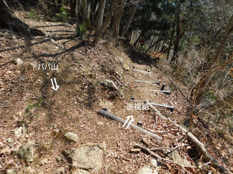 -- 鉄塔の脇から送電線巡視路(右)を下りる。