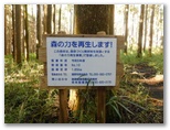 白い水道タンクを右に見てすぐ、広々とした平地に出ました。ここで小休止。少し汗ばんだので、上着を脱ぎました。コンビニで行動食として買った「スティックメロンパン」(6本入)を1本食べます。いくぶん動きの良くなった体で引き続き進んでいくと、深い杉林に入りました。ここで「森の力を再生します!」という看板が目に止まります。林床まで日差しが届き、下草がたくさん生えた、健康そうな杉林。針葉樹の植林であっても、こういう森は好きです。