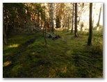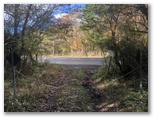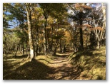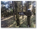 10時丁度、車道に出ました。斜め向かいに登山歩道が続いています。歩いてきた道を指す「須山口下山歩道」の標識にも初めて気づきました。腕木の先が赤く塗られているので、はっきり登山歩道と区別できます。以後、登山歩道と下山歩道の2標識を、ほぼセットで見ることになります。この車道を越えると、苔に覆われた平地があり、動物の糞尿のような臭いがしました。その後、未舗装の林道(?)を少しだけ歩き、10時30分、ようやく杉林を抜け出ました。