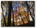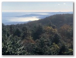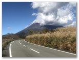 30分ほど降って、雨が上がりました。たちまち青空が戻り、木々が輝き始めます。こんなとき、脳内を流れるのは交響曲「田園」の第五楽章。紅葉・黄葉を愛でながら、軽快に足が進みます。付近に誰もいないのをいいことに、「晩秋の頃」を口ずさみました。♪茜や、金色、落ち葉の道...♪ そして最後にトラロープをまたいで、車道に飛び出しました。水ヶ塚は左方向です。ここで、うれしや、富士山の勇姿! 黒雲は離れつつあり、代わって白い雲が吹き出ていました。