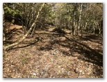 弁当場より先で、中小の岩石がゴロゴロした道になりました。ここまでの道がとても歩きやすかったので、少し歩きにくく感じますが、特に困難はありません。弁当場から20分ほど歩くと、道が左に折れ、斜面を少し登って平坦な林に入りました。落ち葉のために踏み跡が不明瞭ですが、この辺りからピンクテープが頻出します。ピンクテープを追っていくと、薄い踏み跡が続いているのが分かります。ピンク色は見つけやすく、目印としてはいい色だと思いました。