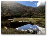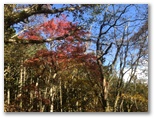 無事、対岸に上がると、青空を背景に、きれいな紅葉と黄葉が輝いていました。天に祝福されているような気分になります。道は再びのどかになりました。赤紫色のホオノキの実を拾ったり、アカスジキンカメムシの幼虫を撮影したりと。程なく、左手の空間が開けて、フジバラ平に到着しました。山中にオアシスのような池があり、空を空よりも青く映しています。休憩の好適地ですが、ベンチやテーブルはありません。立ったまま、おやつタイムにしました。