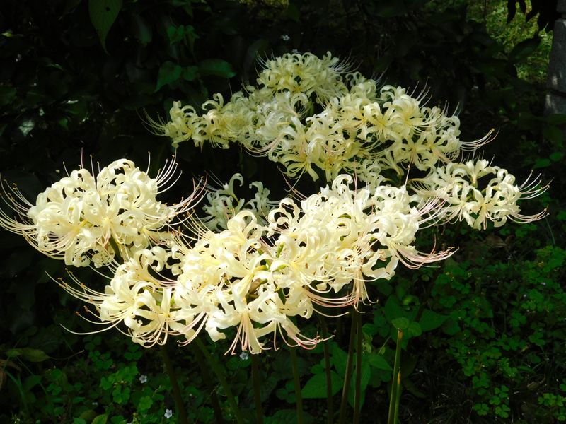 -- 白花のヒガンバナの蕊はピンク色を帯びている。