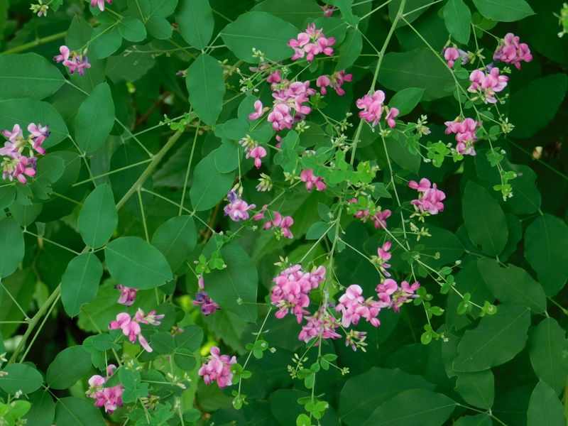 -- プロムナードのせせらぎを彩るハギ。