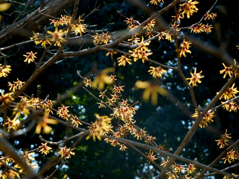 -- マンサクの花。遠近があって、撮りにくい。