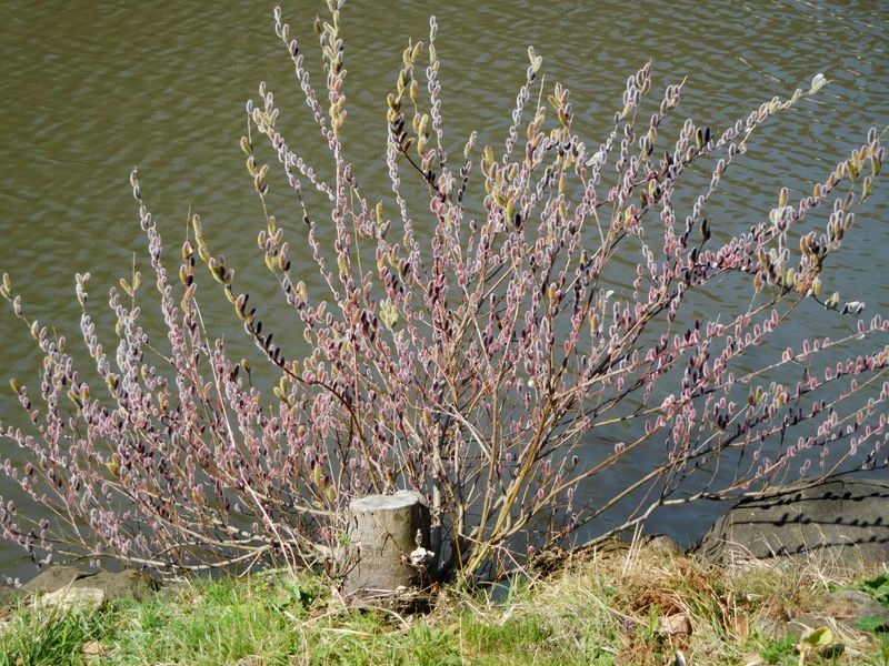 -- はす池の端に、ネコヤナギ。