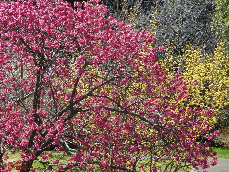 -- カンヒザクラ(寒緋桜)。サンシュユをバックに。
