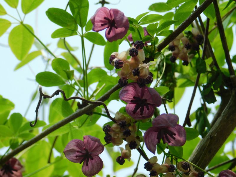 -- アケビの花を見上げる。五枚葉。