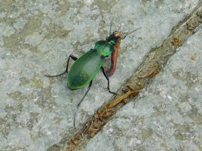 -- ミミズをくわえて走る、アオオサムシ。13:22