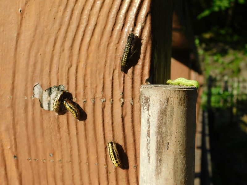 -- キアシドクガの幼虫(上)、さなぎ3頭、青虫1頭。