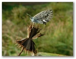 2019年11月7日(木) ◆時差ボケで眠くなる午後、眠らないために四季の森公園へ行く。◆園内に目立つほどの鮮やかな色彩はないな、と思ったが、よく探すと色々と見つかった。◆草原にはヤマトシジミの♂♀たち、高速飛行は新鮮なルリタテハ、銀色の翅はウラギンシジミ。この季節に目にするウラギンシジミは、なぜか大抵♀だ。◆チカラシバの穂が揺れたので、見ると小さなキボシカミキリがいた。◆種々の白い野菊の花が咲いている。似たような花なので同定は苦手だが、園内に張られた「公園に咲いている花・蕾・実など」の写真に助けられた。◆好天にもかかわらず、園内に人影はまばらだった。