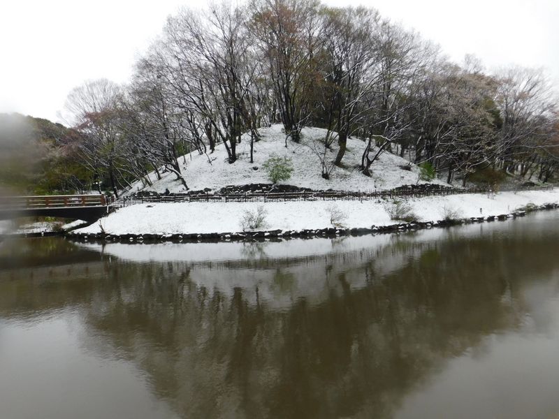 -- 里山花壇。樹上の着雪はほぼ落下した。