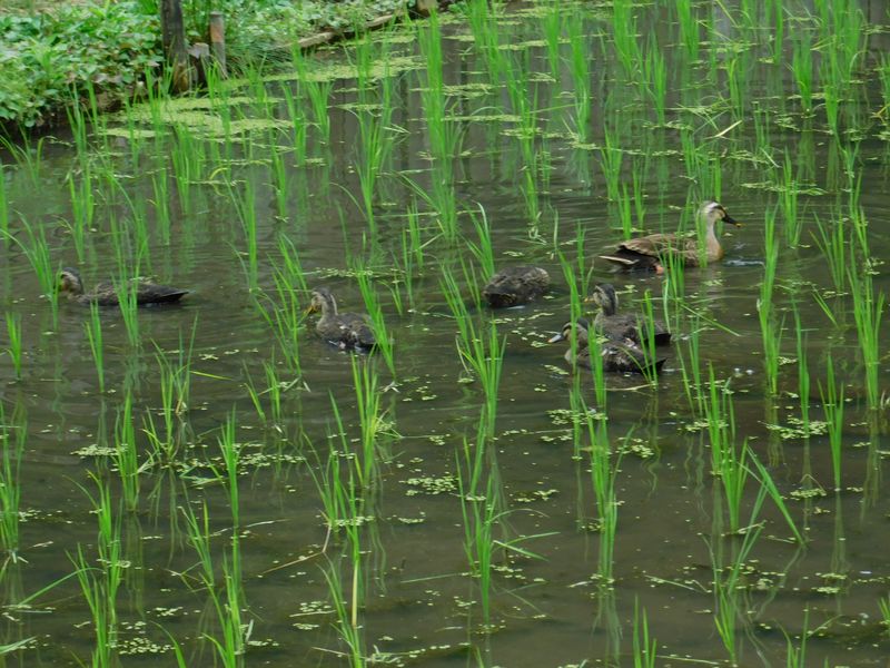 -- カルガモ家族。親1羽と子5羽。