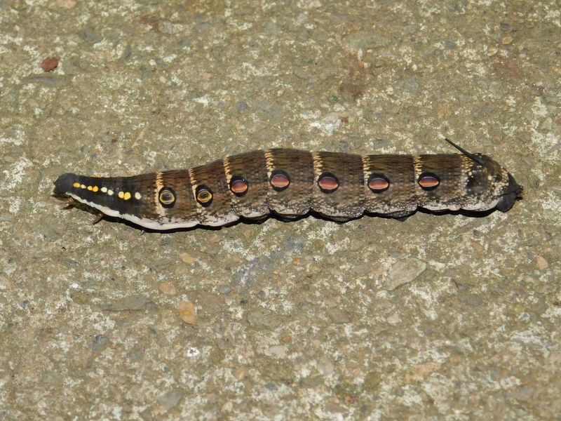 -- セスジスズメの幼虫。左が頭部。