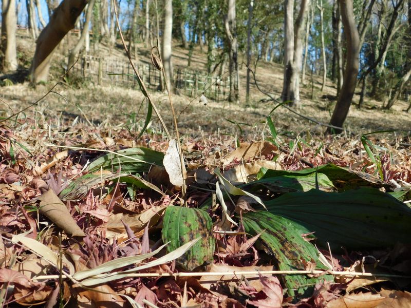 -- カタクリの葉に昨年の果皮。