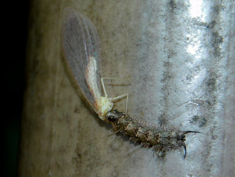 -- クサカゲロウを咬む、フタスジヒラタアブの幼虫。