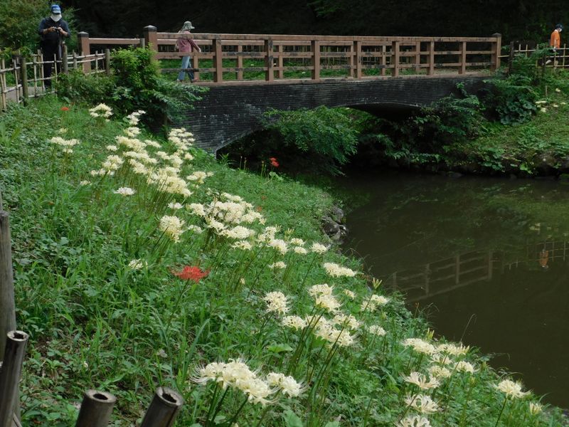 -- 淡いクリーム色のリコリスと蛍川橋。