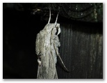 2021年9月19日(日) ◆台風14号が強い雨と風とを伴って襲来したが、関東南岸で温帯低気圧となって東の海上へと離れていった。嵐の時、虫たちはどうしていたのだろう? 早朝、まだ強い風の吹く中、灯火ポイントへ向かった。◆風はまもなく穏やかになった。ポイントに着くと、カメムシの他、3頭の蛾を発見。その1頭は、お腹の大きいヤママユ♀で、駐車場のアスファルトの上で、びしょ濡れになっていた。昨晩飛んできたとすれば、かなり長い間雨に打たれたと思う。◆雨が上がると、素晴らしい青空が出たので、四季の森公園へ。ヒガンバナは花が古くなったものだけが倒れ、新しい花はしっかり立っていた。オニヤンマとギンヤンマは普段よりも多そう。◆トイレ5か所を点検。結果は、6種、0、3種、13種、0。特筆すべきは、4番目のトイレ:これまで虫を見たことがなかったが、きょうは13種14頭もいた。◆今朝見たヤママユは、まもなく生命が尽きると思う。産卵できないかもしれない。他方、ベンチの脚に止まっていたエビガラスズメは濡れていなかった。その流線型の翅は、撥水や保温の上で、ヤママユの大きな翅より有利だと思う。その上、ヤママユガ科の成虫は飲食をしない。