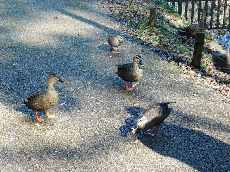 -- カルガモにパンくずをやるおじさん(影のみ)