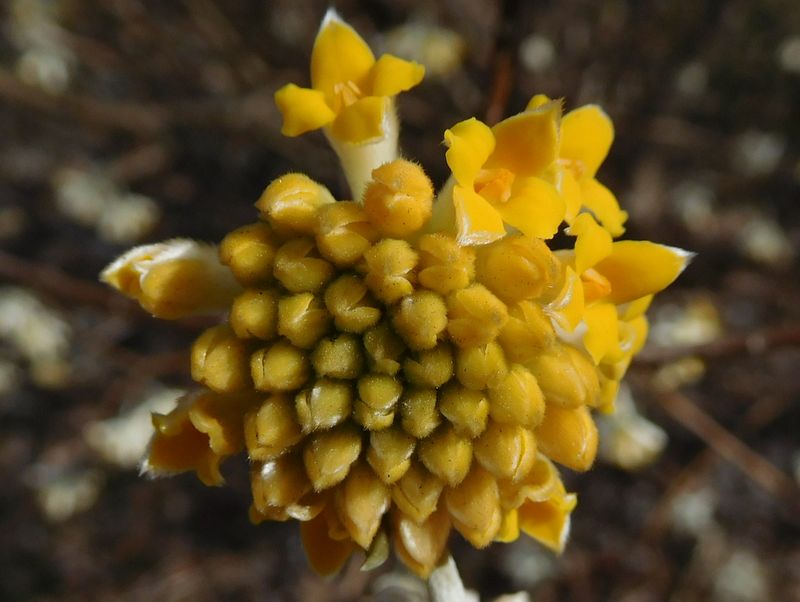 -- ミツマタの集合花は周辺部から咲く。