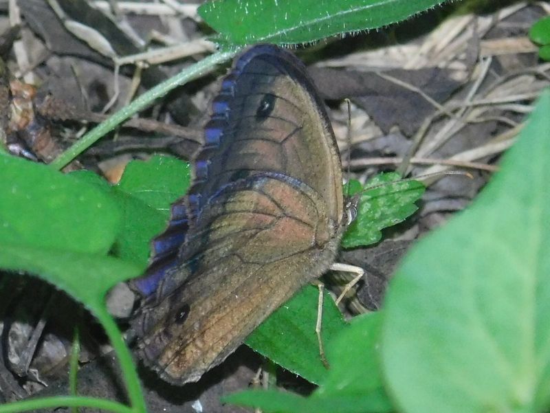 -- ジャノメチョウ:フラッシュ光で紫色の反射。