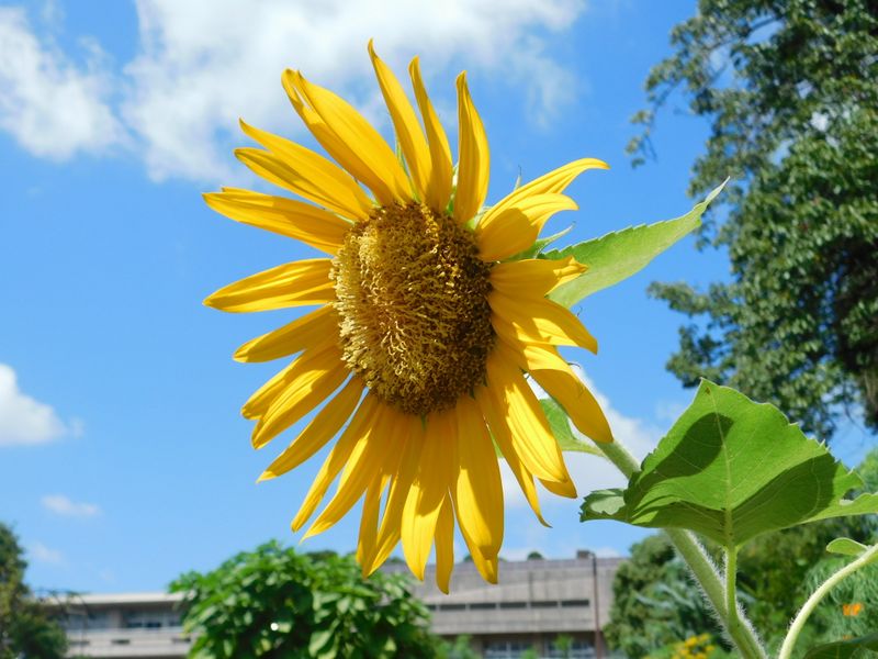 -- 太陽に顔を向ける花。背景は中山中学校。