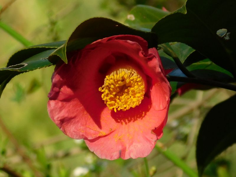-- 花粉がこぼれる、ヤブツバキ。