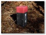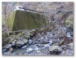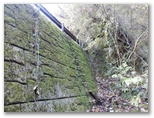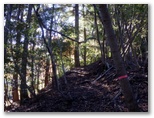 作業道はしっかり付けられていて、その上を低い電線が走っています。子供の頃によく見た、木製電柱に電笠と裸電球だけのレトロな照明もありました。今いる場所が、六百沢左岸尾根の末端です。左に取り付きやすそうな箇所を探しながら、吊橋から5分ほど行くと、前方に堰堤が見えてきました。この先は谷になるので、ここから尾根に取り付きます。尾根を見上げると、なかなかの急登ですが、四駆(両手両足)モードで登れば、安全は十分に確保できると思いました。