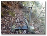 橋の上の釣り人、林道に立つ野鳥撮影のカメラマンたちと、小声で挨拶を交わします。早戸川橋に来ると、橋の上に人がずらりと並んでいました。三脚に大口径レンズ。何を狙っているのでしょうか? 私は早戸川橋を渡らず、早戸川右岸の林道に進みます。10分ほど行くと、六百沢に断ち切られるようにして林道が終わりました。コンクリート壁の梯子を降りて、飛び石伝いに沢を越えます。地形図にある右手の吊橋は、施錠されていました。ここから狭い作業道を進みます。