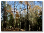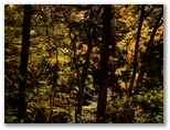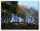 脚力と腕力に任せ、ひたすら登ります。尾根に乗ると薄い踏み跡が見つかり、手は使わなくてもよくなりました。林相は、広葉樹にアカマツの混交林。左側の谷に陽が差し、所々で美しい紅葉が見られます。突然下の方から犬の吠えるような大きな声が聞こえてびっくり。よく聞くと、マス釣り場の駐車場のアナウンスでした。しばらく後、今度は上空に「ピヒュー、ピヒュー」とやや軋むような声。見上げると、オオタカです。私を見て一旋回し、どこかに飛んで行きました。