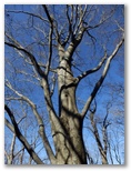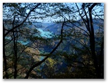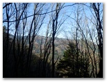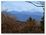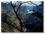 尾根は、左(南東)がヒノキの植林、右(北西)が自然林になりました。落ち葉の敷き詰められた、足に優しい道です。樹木のまばらな場所で振り返ると、枝を透かして宮ヶ瀬湖と早戸川の青い水を望めました。もしうるさい木の枝がなければ、素晴らしい構図です。どこかにスッキリ見渡せる展望地はないかと、振り返り、振り返り、登って行きましたが、最後まで見つかりませんでした。眺望が優れないとはいえ、尾根自体は円やかで、薮もゴミもなく、快適です。