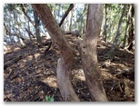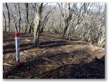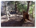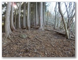 今こそ、1000mに向かって下ります。右手に現れるはずの尾根を探しながら行くと、あの緩い勾配の地点で栂立尾根が右に屈曲していました。間違いなく、ここが1000mです。これ以降は、自信をもって栂立尾根を下って行きました。清川村の境界杭があります。見覚えのある「異種合体の木」もあります。そして登りに転じると「着かず離れずの木」を見て、栂立ノ頭に到着しました。わが懐かしの峰です。すでに時間との闘いに入っていましたが、ここでお茶にしました。
