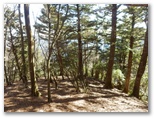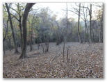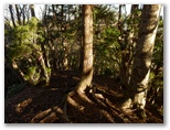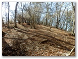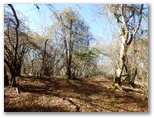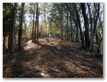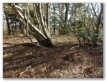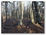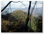 655mからの尾根を合わせるその稜線に立つと、登ってきた尾根が、心もち左に折れます。右手の自然林がほぼ落葉し終わり、枝越しに焼山から姫次に至る稜線を望めました。地面にフカフカ感があるのはカラマツ林。その黄葉も大部分すでに落ちています。空けたカラマツの枝越しに望める宮ヶ瀬ダム。そして、そこから少しだけ登ると、明るい平坦地に出ました。ここが訪ねて来た標高888m地点です。特に目を引くようなものは、何も見当たりません。ただ、のどかです。