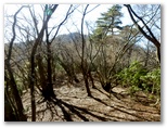 昼食を終え、上を目指します。右手の樹木が疎になって、蛭ヶ岳や榛ノ木丸をよく望めるようになりました。蛭ヶ岳の手前に見える尾根が、本間ノ頭の北尾根でしょうか。眺望を楽しみながら、そこからゆっくりと10分ほど登ると、勾配が緩くなりました。実はそこが栂立尾根と出合う1000m地点だったのですが、私は左から上がって来るその栂立尾根に気づかず、素通りしてしまいました。そして、左から別の尾根を合わせる1043m地点を、1000mと勘違いしたのです。