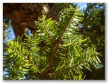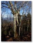 1043m(1000mと思い込んでいる)では、本間ノ頭を望めました。きょうは鐘沢ノ頭まで、栂立尾根を登って行きます。清川村の境界標である赤帽黒杭が点々と見られるようになり、栂立尾根に入ったことを実感しました。大きなモミ、ツガ、ブナなどの木がたくさん見られます。ほどなく左手に大山を望み、特徴あるブナを見て、鐘沢ノ頭(1109m)に到着しました。昨年は1000mから約30分かかったのに、今回は約20分。いやに早かったな、まあ気のせいか、と思いました。