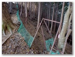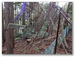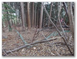 鉄塔直下の脚立を乗り越え、鹿柵の右側を歩いて行きます。すると、明瞭な踏み跡が右に分岐しました。思わず嬉しくなりそうなほど、きれいな踏み跡です。でもこれに誘い込まれてはいけません。昨年1月の下りでは、ここに引き込まれ、金沢に下りてしまいました。あくまで鹿柵に沿って歩き続けながら、軽く登り返すと、鹿柵が右に折れます。この角にある破れ穴を通って、その向こう側に下るのが正解ですが、今回見ると鹿柵が破損していて、容易に通り抜けられました。
