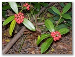 ミヤマシキミの赤い実がありました。もうフラッシュなしでは手持ち撮影ができないほど暗くなっていました。どんどん下ります。尾根の最終端の手前で右に逸れ、うす暗くなった薮道を下って行くと、まだ明るい早戸川林道が見えてきました。大きなレンズとカメラを抱えた人が歩いています。16時40分、無事に金沢橋のたもとに下り立ちました。真っ暗になる前に汁垂隧道を抜けたいと思い、足を速めます。でも夕闇の足は速く、あっという間に真っ暗になりました。