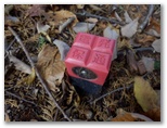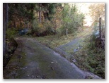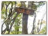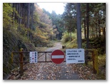 人里を抜けると、「通行止め」のゲートがありました。この先に土砂崩落があり、「関係者以外立入禁止」と書いてあります。これより2分ほど先、右手に分かれる林道を登ると、相変わらず放置された廃車がありました。そのすぐ先で、左手の山道に入ります。この道は送電線巡視路を兼ねていて、小さな黄色の標識が、送電鉄塔356号を指しています。その後、354号と別れるまで、この小さな黄色の標識が、丁寧に道案内をしてくれました。