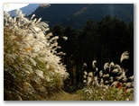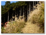 さてその山道は、古くからの峠道によくあるように、緩やかな勾配で山腹を無理なく上って行きます。ここを歩くのは二度目。ちょっと楽しみな場所があります。そこは空が開けて、左手の高みに送電鉄塔356号を望める、数十メートルの日向みち。4年ぶりに、その場所にやって来ました。金銀のススキが陽光を浴びて、訪問者を歓迎するように植わっています。のどかな日の当たる坂道。ここで小休止し、上着を脱ぎました。小さな甘菓子を1個食べ、お茶を飲みます。