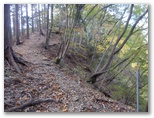 黄色の標識が354号を指しているのを確認し、送電線巡視路を下ります。ここからは初めて歩く道。測量して造られたのか、勾配がほぼ一定です。谷側にザレ止めが設置されてはいるものの、道は斜面との同化が進んでいました。この季節は落ち葉も多いので、下りではスリップに注意が必要です。でもおよそ半ばまで下ると、道幅が広がり、歩きやすくなりました。354号を右に見送ると、まるで遊歩道のような極上の道に。最後は小沢に沿って歩き、車道に下り立ちました。
