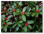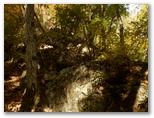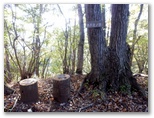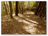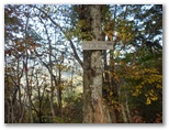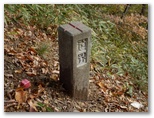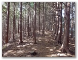 展望を十分に楽しんだので、入道丸に向かいます。足どりも軽く杉林の道を登って行くと、足下にすみれの小株がいくつも見られました。春に歩けば、きっと可愛らしい花がほほ笑んでくれるでしょう。道には新型の赤帽黒杭が点々と打たれています。頭には「電発保通」の四文字がありますが、どんな意味でしょうか。三等三角点のある入道丸東峰を通過すると、右手が自然林になりました。紅葉と黄葉も見られます。そして鞍部を経て、少し登り返すと入道丸西峰でした。