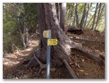 阿夫利山の山頂にも、慎ましい山名標がありました。展望は大室山が何とか望めるだけです。南の空が暗くなり、急に強い風が吹いて来ました。少し先を急ぎましょう。山頂から3分ほど行くと、地図でははっきりしませんが、登山道が左に屈曲します。ここには道標が立っているので、道を間違えることはありません。「富岡バス停・秋山温泉」を指す方向に進みます。富岡に帰りの路線バスはないので、秋山温泉の送迎バスを利用するつもりです。