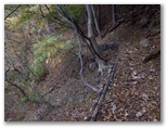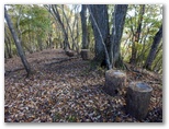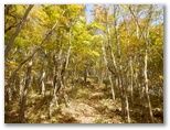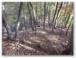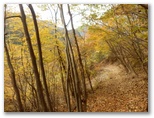 山頂を辞し、東に延びる尾根を下ります。下り始めると、また強風が吹いてきました。どんどん下ります。落ち葉が堆積して、フカフカした感じが足から伝わってきました。注意するのは、尾根を横切るU字状の溝から、左のトラバース道に入るところです。道標はありません。尾根の立ち木にテープが巻いてありますが、これは「こっちに進め」ではなく、「ここで曲がれ」の意味だと思いましょう。あとは迷いそうなところもなく下り続け、やがて平坦地になりました。