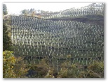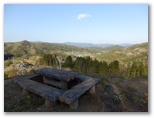 461m地点も過ぎ、引き続き緩やかに下って行くと、動物除けの頑丈なゲートがありました。簡単に開きましたが、閉じて鎖で結わえるのが、ちょっと面倒です。そしてゲートのすぐ先、もう少しで林道に下りる地点で、パアーッと広大な空間が出現しました! ベンチとテーブルもある、素晴らしい展望台です。これはびっくり。きょうは3か所に優れた展望地がありましたが、ここは、山と里とを箱庭のように見晴らせるという点で、ピカイチの展望台です。